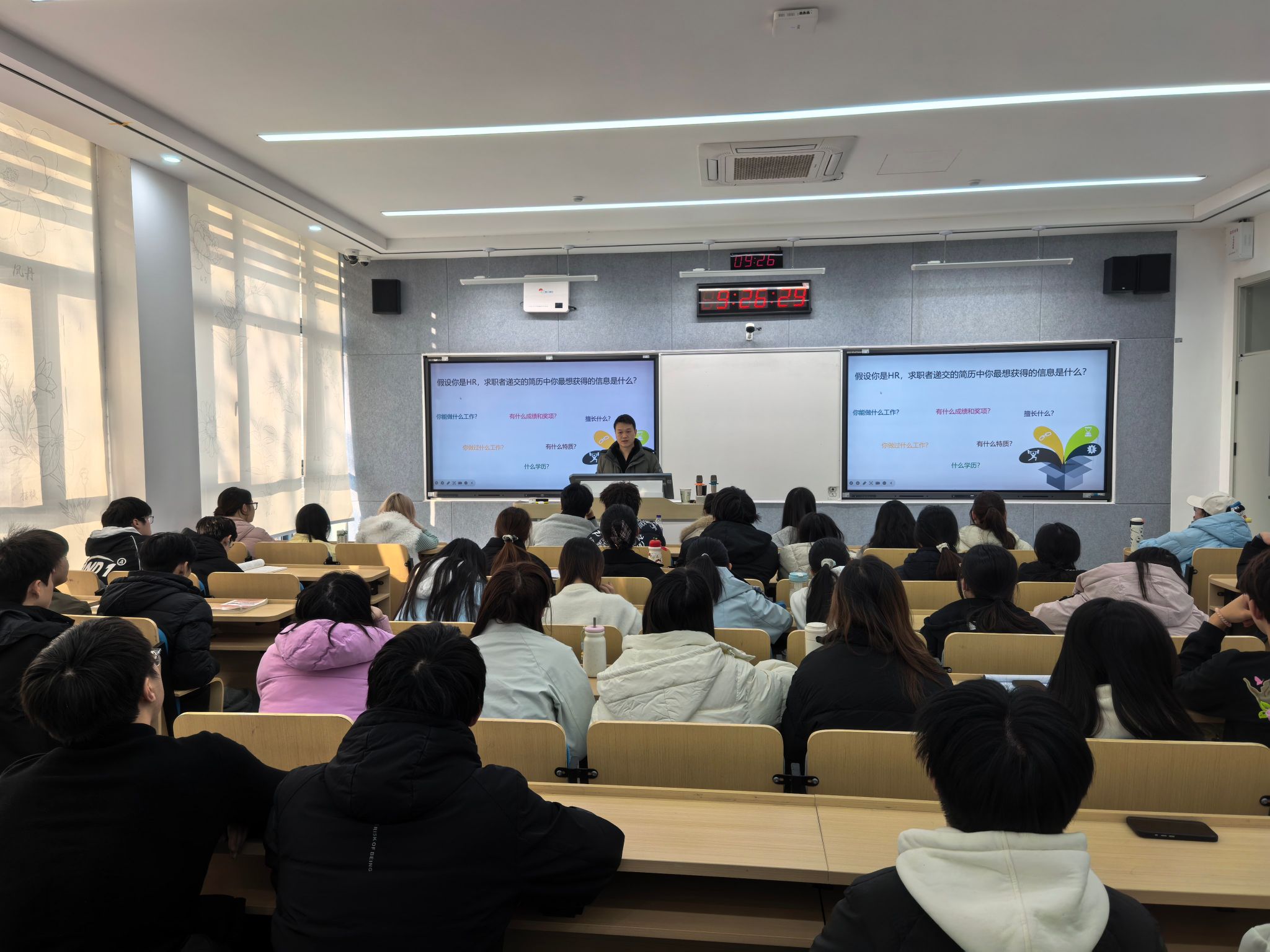 课堂上,任课老师王雷雨围绕简历制作核心要素、不同岗位简历侧重点等内容展开讲解,通过案例分析、现场讨论互动等形式,引导学生主动思考如何提前做好求职准备。课堂氛围良好,气氛异常活跃。