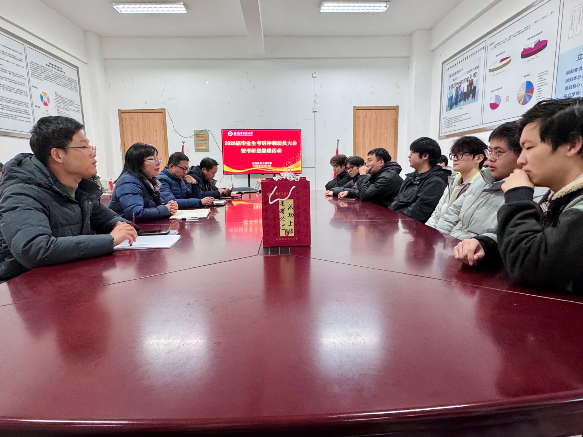 冬至将至,寒潮来袭,一年一度的全国硕士研究生招生考试也进入最后的冲刺阶段。为切实缓解备考学子压力、提振迎考士气,充分传递学院党委对青年学子的关怀与支持,12月15日,医药信息工程学院精心组织召开2026届毕业生考研冲刺动员大会暨考研送温暖活动。学院领导班子成员,全体毕业班辅导员以及考研同学代表参加,动员大会由学院党委副书记王向阳主持。