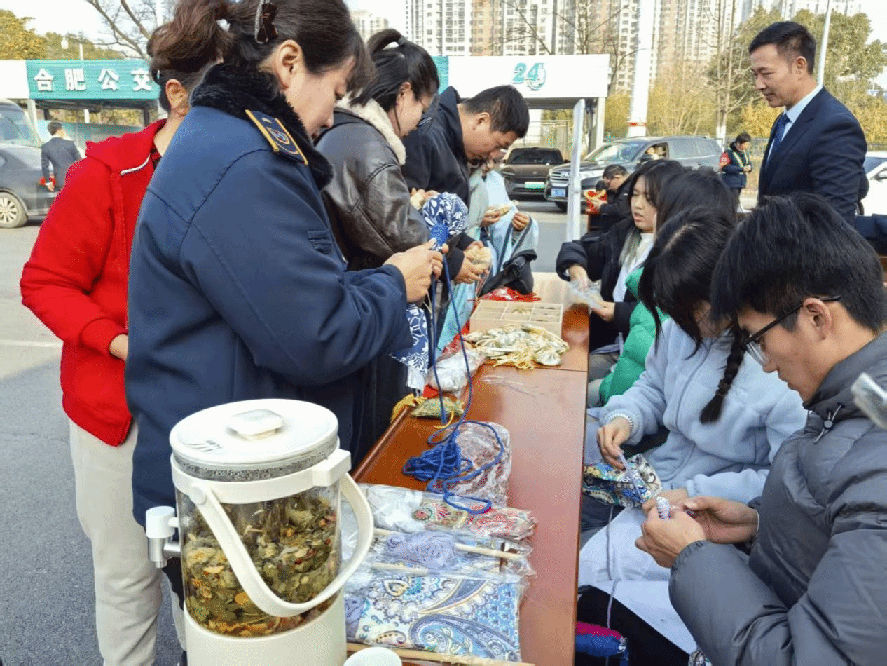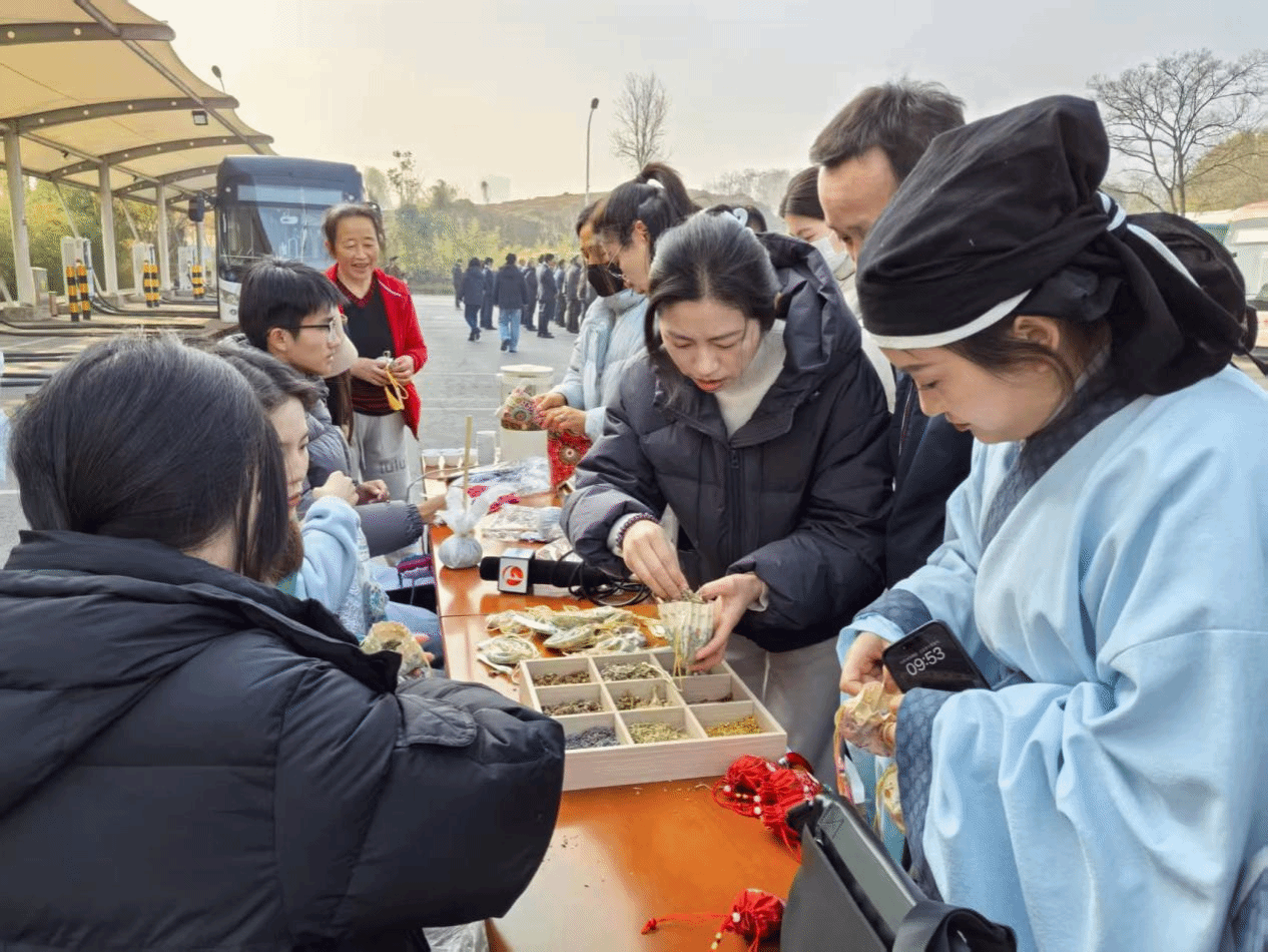 本次活动针灸推拿学院党委、团委积极响应,以“传承精华、守正创新”为己任,组织师生志愿者投身其中。启动仪式现场,针灸推拿学院师生编排的五禽戏表演——《时空仁心—华佗与现代的邂逅》情景演绎引人入胜,表演引得围观市民竞相模仿,艾草香囊制作工坊的草药芬芳弥漫全场。从一味药茶的精心配制,到一枚香囊的巧手缝制;从艾草锤中传递的温热关怀,到五禽戏演练中流淌的千年导引智慧——这一切,皆是学院“华佗菁英”学子将课堂所学向服务社会的自然延伸,是“强素养、读经典、跟名师、做临床”育人理念在更广阔天地间的鲜活注脚。同学们的专注投入与专业素养,得到了公交集团公司与广大市民的认可,这无疑是对学院人才培养质量的最佳褒奖。