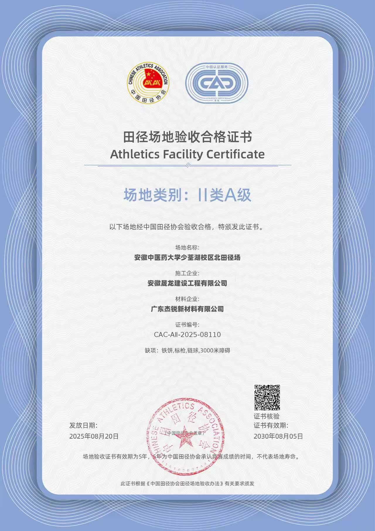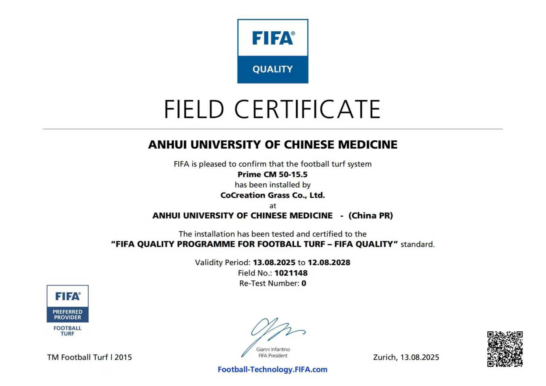 中国田径协会二类A级场地合格证和FIFA Quality认证挂牌