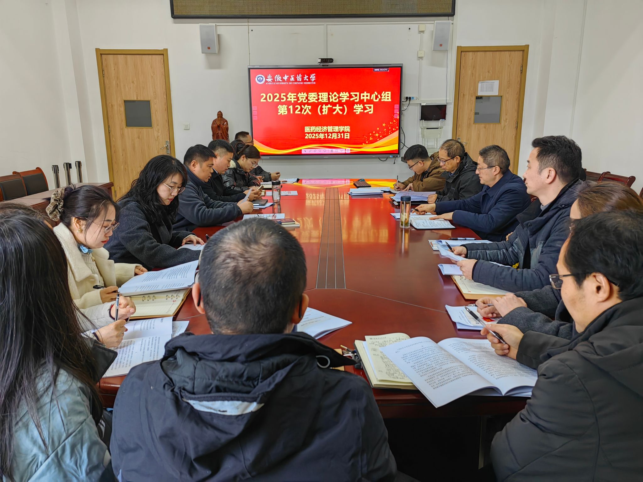 12月31日,医药经济管理学院党委召开2025年党委理论学习中心组(扩大)学习会,围绕习近平法治思想和2025年中央经济工作会议精神开展专题学习。学院党政领导班子成员、党委委员、各党支部书记及各系(教研室、中心)主任参加学习。学院党委书记张军主持会议。