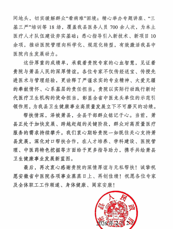 医院始终践行新时代医疗卫生机构使命担当,以实际行动推动优质中医药资源下沉。萧县人民政府的感谢信任既是对医院帮扶工作的认可,更是对未来合作的期许。下一步,医院将持续深化与萧县的对口帮扶合作,在人才培养、学科建设、中医药特色挖掘等方面持续发力,不断提升基层医疗服务能级,让中医药福祉更多惠及基层群众。