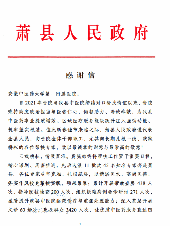 在新春佳节来临之际,第一临床医学院收到来自萧县人民政府发来的感谢信,信中向全体干部职工及帮扶专家致以诚挚谢意与崇高敬意,高度肯定了医院三年来对口帮扶萧县中医院的丰硕成果与突出贡献。