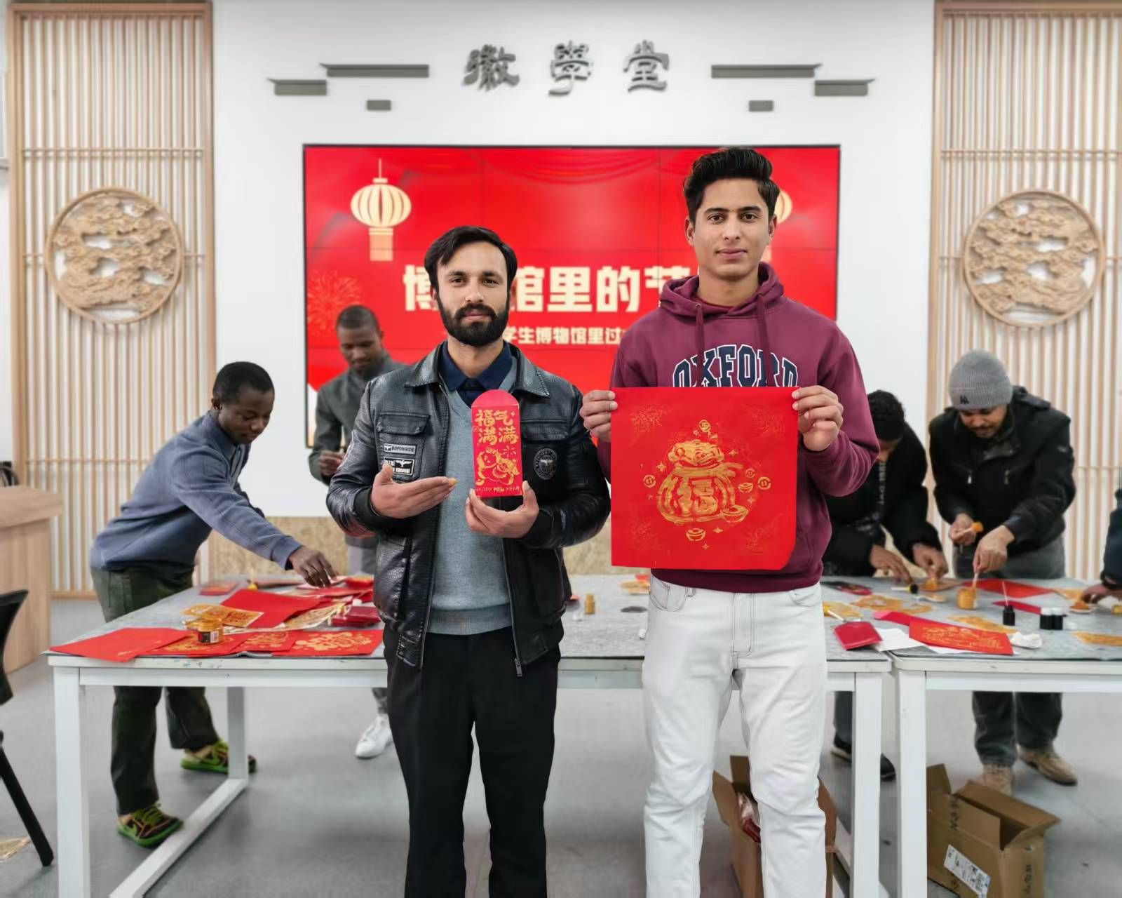 笑语漫过徽派古建青瓦,红纸裁来马岁新春吉祥。2 月 17 日,中国农历大年初一之际,我校组织来自阿富汗、摩洛哥、坦桑尼亚等国的近50名春节留校国际学生走进安徽省博物院,沉浸式体验了安徽历史的厚重底蕴与中国年俗的独特魅力,在博物馆里度过了一个意义非凡的新春佳节。