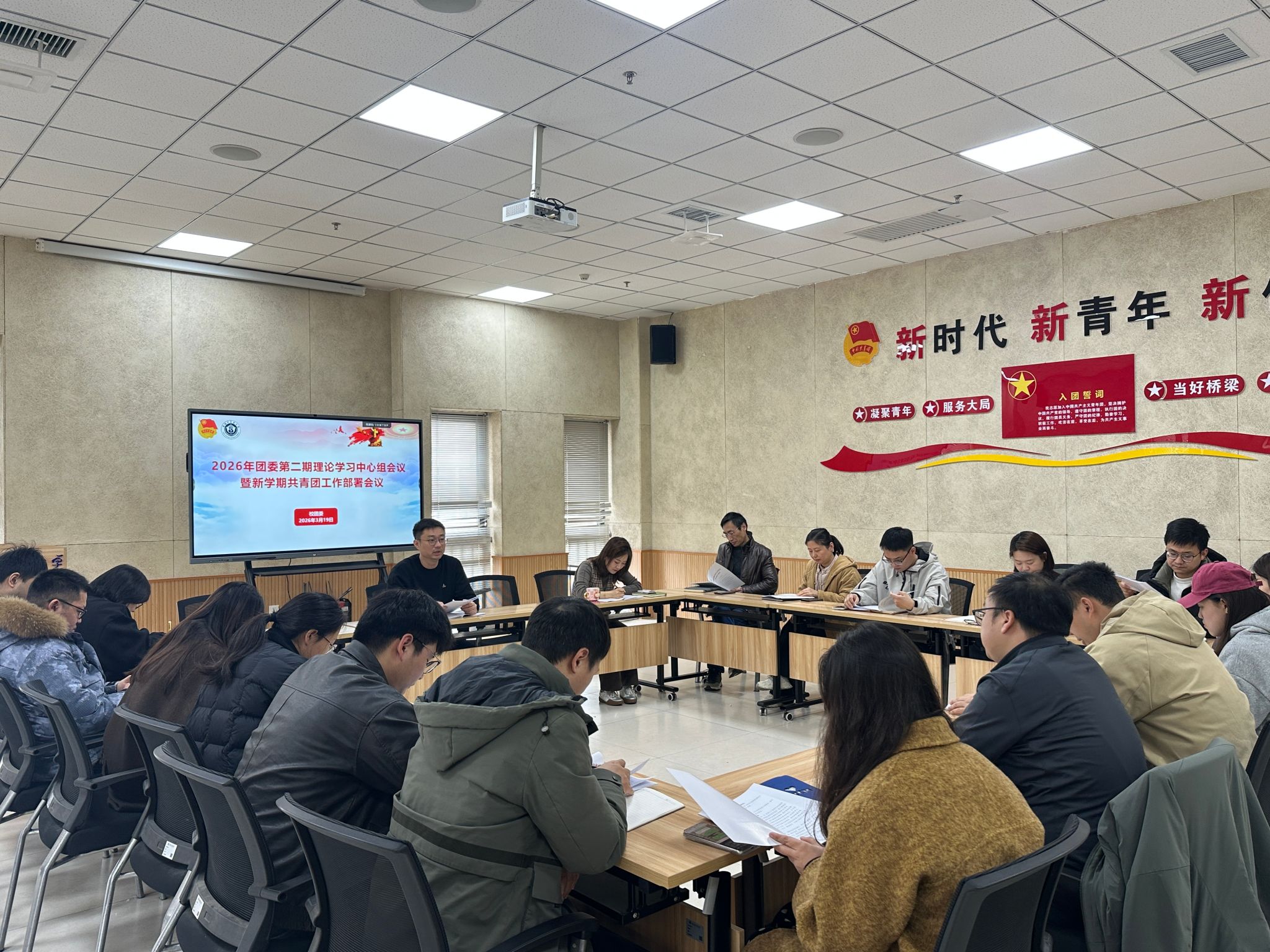 3月19日上午,校团委召开2026年第二期理论学习中心组会议专题传达学习全国两会精神,部署新学期学校共青团工作,校团委全体成员、各学院分团委(团总支)负责人参加会议。