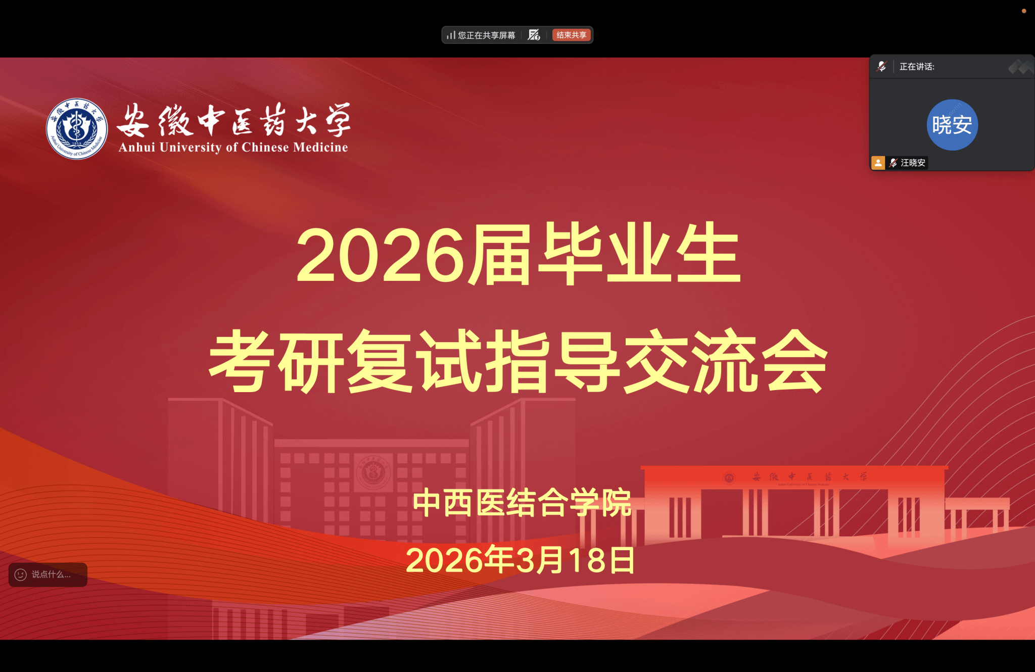 为助力2026届本科毕业生更好地备战考研复试,3月18日晚,中西医结合学院通过腾讯会议平台,以线上形式举办考研复试指导交流会。会议邀请2025届成功考取硕士研究生的王雨晴、王升本、孙昊和孙明四位优秀毕业生担任主讲嘉宾,学院2026届本科毕业生及辅导员参会。会议由学院就业办汪晓安老师主持。