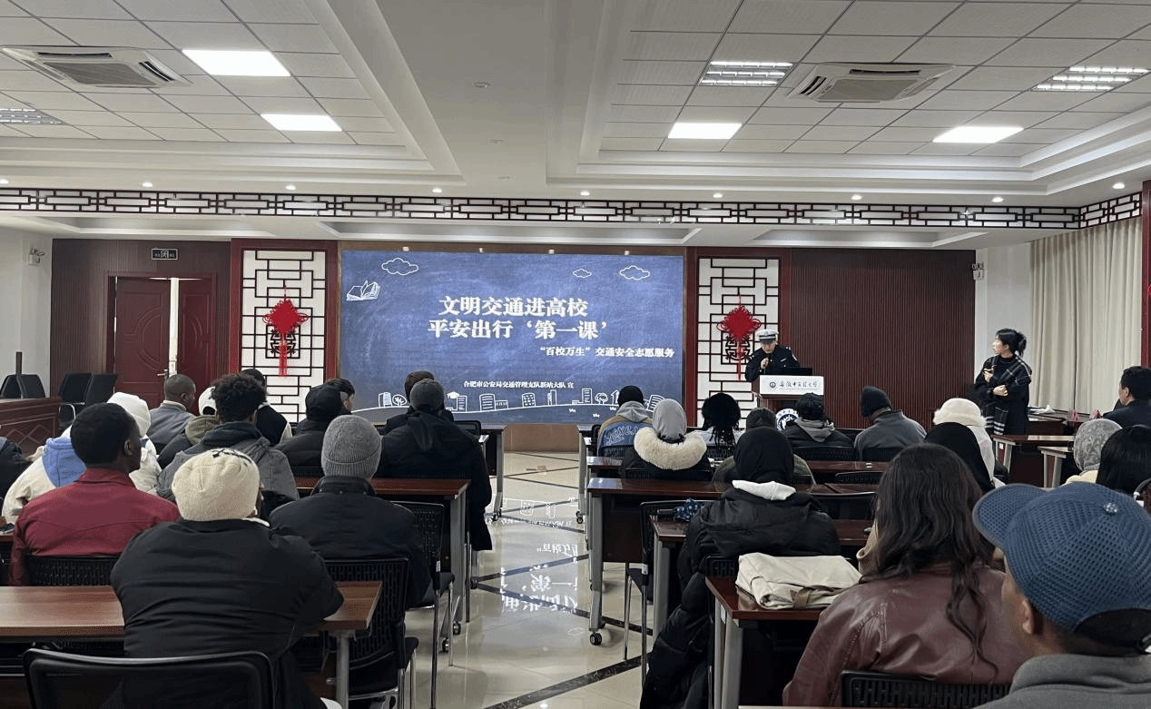 会上,合肥市出入境管理局宣莹莹警官以《中华人民共和国出境入境管理法》为核心,结合国际学生实际需求,系统讲解了签证办理、停留居留及兼职等相关政策,并就禁毒规定、宗教政策和防诈骗要点进行重点提示,引导学生增强守法意识,提高安全防范能力。交管新站大队综合中队宣传员陶静枝警官围绕《中华人民共和国道路交通安全法》开展宣讲,结合真实事故案例,重点讲解了未按规定佩戴头盔、闯红灯、逆行、未按规定车道行驶等行为的危害性,提醒师生自觉遵守交通规则,文明出行。