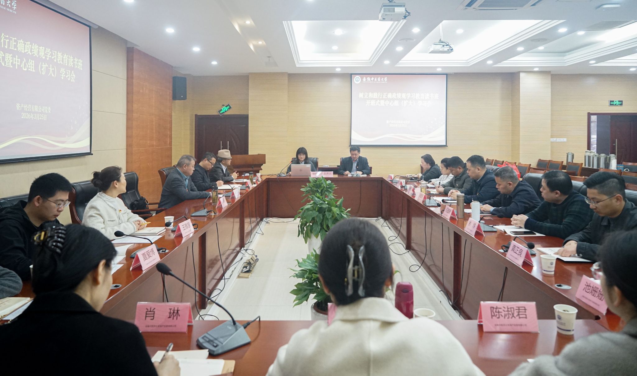 3月25日上午,资产经营有限公司党委在梅山路校区新安楼一楼会议室召开树立和践行正确政绩观学习教育读书班开班式暨中心组(扩大)学习会,公司党委理论学习中心组成员、党支部书记、各部门及实体负责人参与本次学习。公司党委书记、董事长孙道礼主持会议。