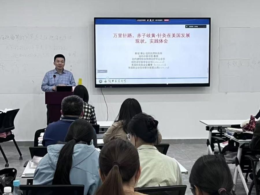 讲座中,蔡斌以“我从哪里来”“美国针灸走到了什么阶段”“我想把什么送给在校的学弟学妹们”三条主线展开分享。他回顾了自己从安徽中医药大学本科到海外执业二十余年的成长历程,特别强调“无论以后走多远,真正能支撑一个人走出去的,始终是扎实的专业基础训练”,以此勉励在场学生珍惜在校期间的中西医基本功学习。