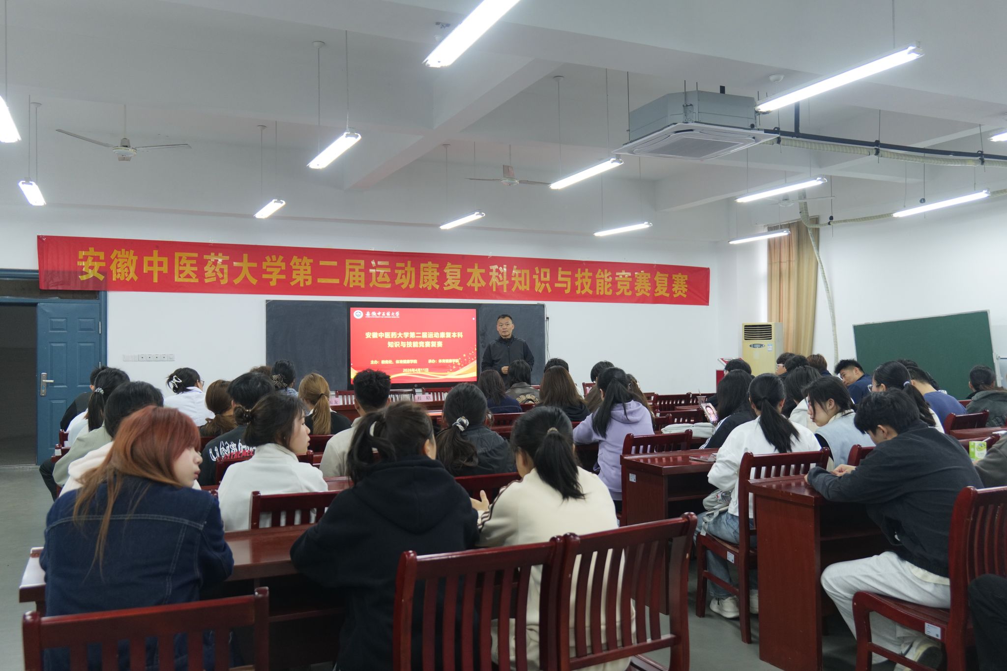 4 月 11 日,安徽中医药大学第二届运动康复本科知识与技能竞赛复赛在体育健康学院 A334 教室成功举办。本次大赛汇聚了来自体育健康学院、针灸推拿学院、第一临床医学院各年级学子,共 13 支队伍、近 50 名选手同台竞技。