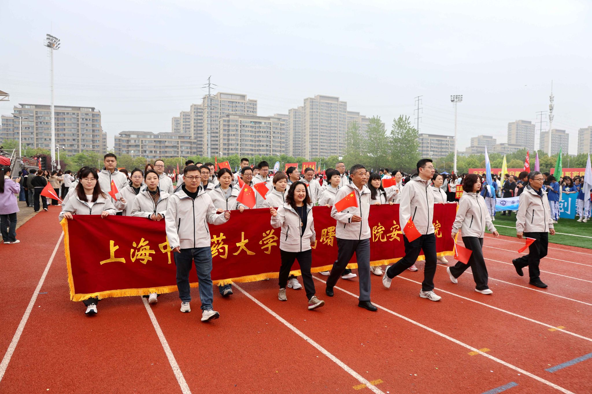 4月16日至17日,安徽中医药大学第十一届田径运动会在少荃湖校区体育场圆满落幕。曙光安徽医院党委书记张永先,党委副书记、执行院长李明,党委委员、副院长程耀堂,党委委员、纪委书记张晓峰,党委委员、总会计师陈黎华,党委副书记李卓,党委委员、办公室主任张军,党委组织员翟从永出席开、闭幕式。由全院50余名职工组成的参赛队伍奋勇争先、团结协作,不仅成功打破教工组女子400米及女子跳高两项校运会纪录,更以5金5银3铜的亮眼战绩荣获教工组团体总分第三名及“体育道德风尚奖”,充分展现了曙光安徽医院职工昂扬向上的精神风貌与强劲的综合实力。