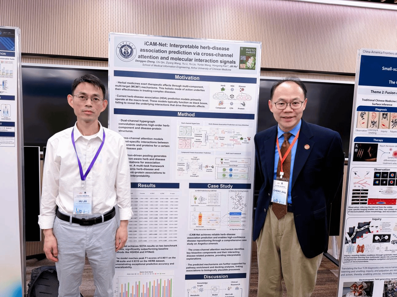 在会议墙报展示环节,胡继礼副教授以《iCAM-Net:融合跨通道注意力与分子互作信号的可解释中药——疾病关联预测模型》(论文的第一作者为学院2024级中医药信息学专业研究生郑登高)为题进行了展示与交流。该研究提出了一种融合跨通道注意力机制与分子互作信号的可解释深度学习模型,旨在解决中药与疾病关联预测、可解释性等关键问题,为人工智能技术赋能中药现代化研究提供了新思路与新方法。