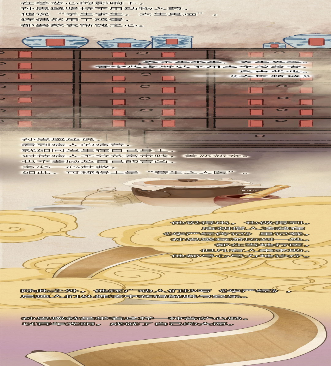 凡大医治病,必当安神定志,无欲无求,先发大慈恻隐之心,誓愿普救含灵之苦。若有疾厄来求救者,不得问其贵贱贫富,长幼妍媸(chī),怨亲善友,华夷愚智,普同一等,皆如至亲之想。亦不得瞻前顾后,自虑吉凶,护惜身命,见彼苦恼,若己有之,深心凄怆,勿避险巇(xī),昼夜寒暑,饥渴疲劳,一心赴救,无作工夫形迹之心。如此可为苍生大医,反此则是含灵巨贼。
